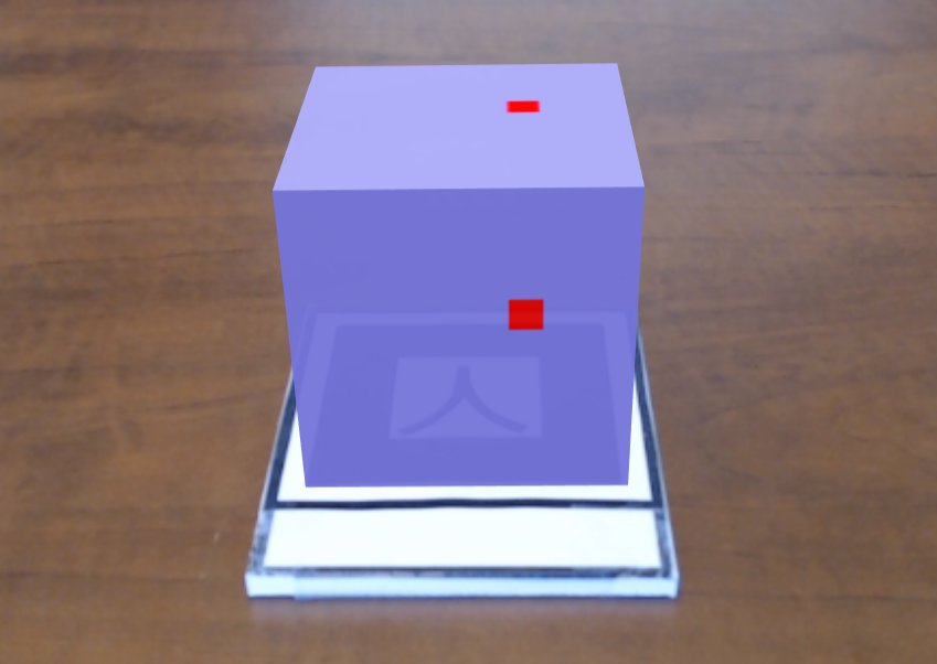 A cube is attached to a kanji marker. Red, yellow, and blue squares are attached to barcode markers 0, 1, and 2. The color of the cube changes depending on which combination of the markers is visible. |