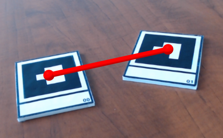 Since lines can be difficult to see, drawing spheres at the centers of barcode markers 0 and 1, and creating a cylinder between the them. (Reorients and rescales the cylinder depending on the distance between the markers.) |