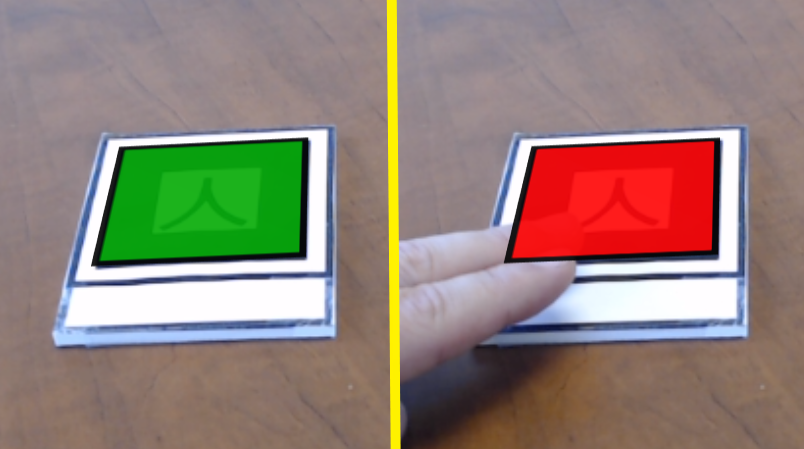 A green square is attached to a marker. If the marker is no longer visible, the square turns red and remains in the last known position of the marker. If the marker then becomes visible again, the square turns green and moves (lerps) to the new position. |